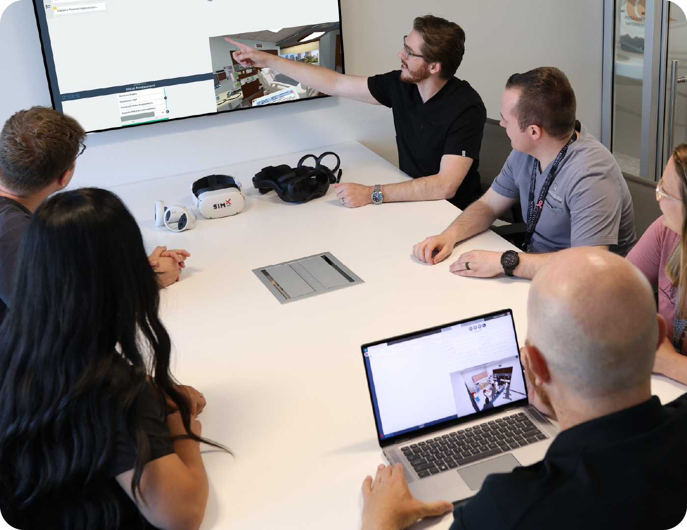 An enriching training experience is more accessible than ever with the SimX patented multiplayer technology. Each simulated patient encounter has multiplayer functionality for both co-located and non-co-located training groups. This means, SimX is the only patented platform designed for multiple learners to work as a team in the same space. This allows SimX users to work in interprofessional teams, improving communication and collaboration skills